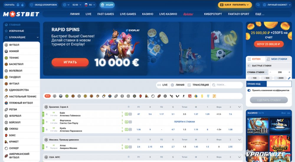 Большой интерес вызывает и роспись спортивных событий — поставить можно практически на всё: от популярных чемпионатов по футболу и баскетболу до нишевых дисциплин и киберспортивных турниров.